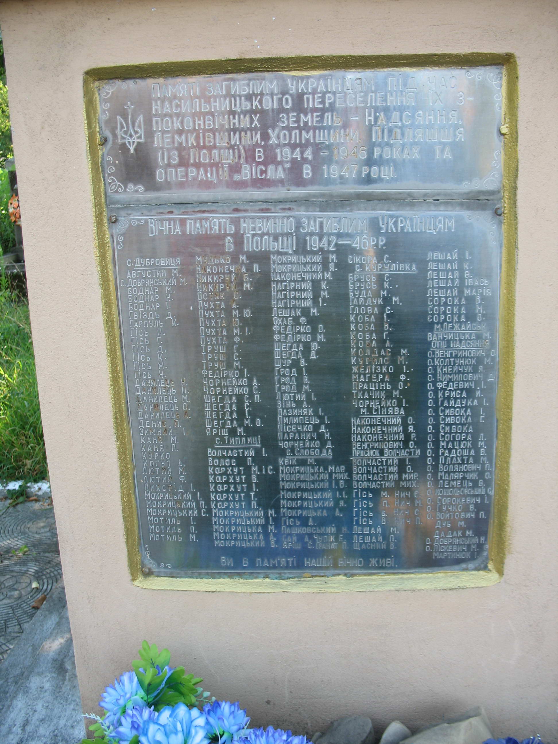 Таблиця з іменами загиблихРозмір зображення: 1944:2592 піксел Фото Зенона Боровця і Богдана Тхора, 10 серпня 2009 р. |