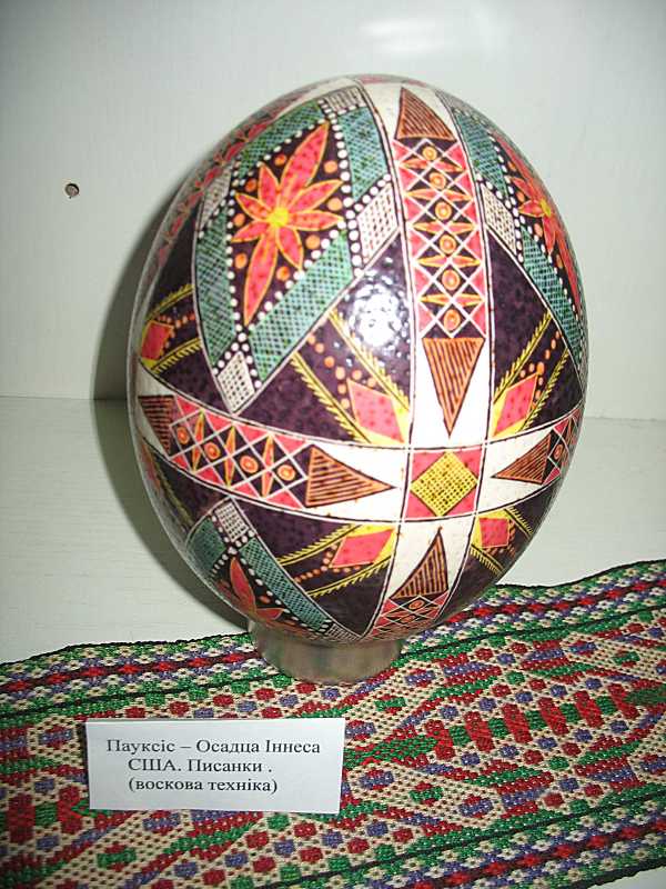 Писанка у восковій техніціРозмір зображення: 600:800 піксел Автор – Оксана Пауксіс-Осадца (США). Фото Зенона Боровця і Богдана Тхора, 21 липня 2007 р. |