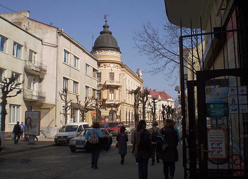 2018 р. Перспектива вул. ТеатральноїРозмір зображення: 800:579 піксел Будинок з куполом в центрі – Музей народного мистецтва, далі за ним – Ощадна кака. Фото Д. Я. Вортмана, квітень 2018 р. |