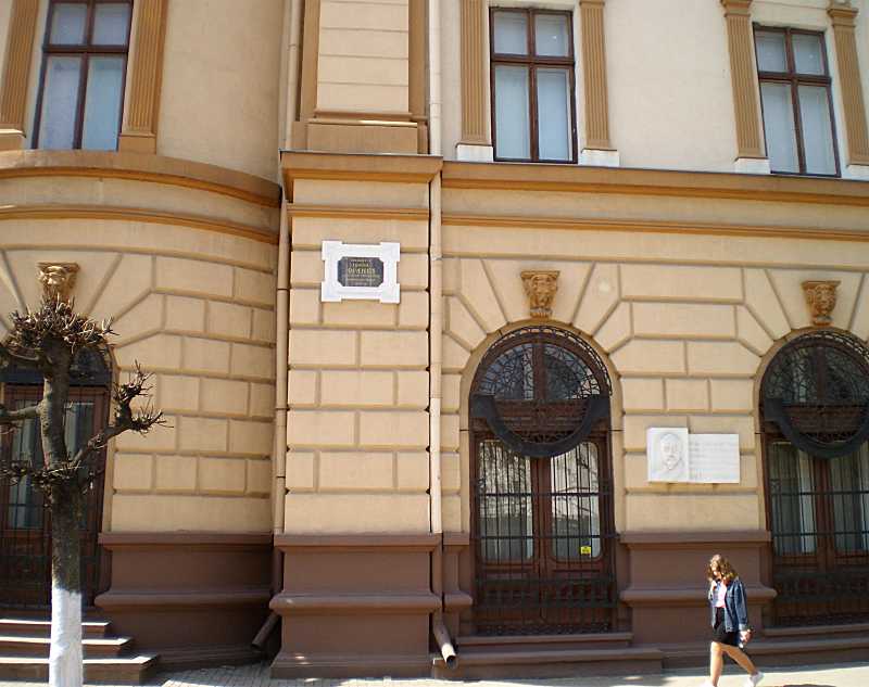 Фрагмент фасаду з меморіальними дошками Розмір зображення: 800:633 піксел Фото Д. Я. Вортмана, квітень 2018 р. Вкладені елементи Меморіальна дошка І. франку