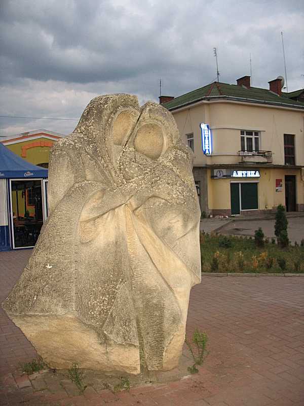 Скульптурна композиціяРозмір зображення: 600:800 піксел Фото Зенона Боровця і Богдана Тхора, 8 серпня 2009 р. Виготовлена з вапняку, встановлена на пл. Відродження у 2000 р., автор – Людмила Сафонова-Альошкіна. |