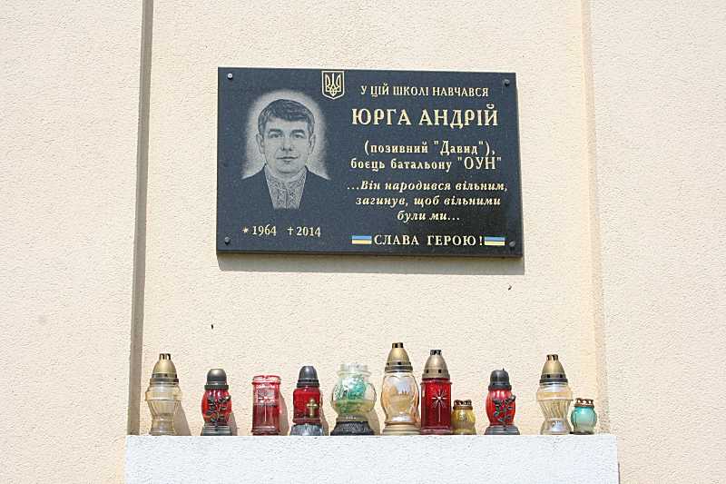 Напис: «У цій школе навчався Юрга Андрій (1964 – 2014) (позивний «Давид»), бієць батальйону «ОУН»… Він народивя вільним, загинув, щоб були вільними ми… Слава герою»