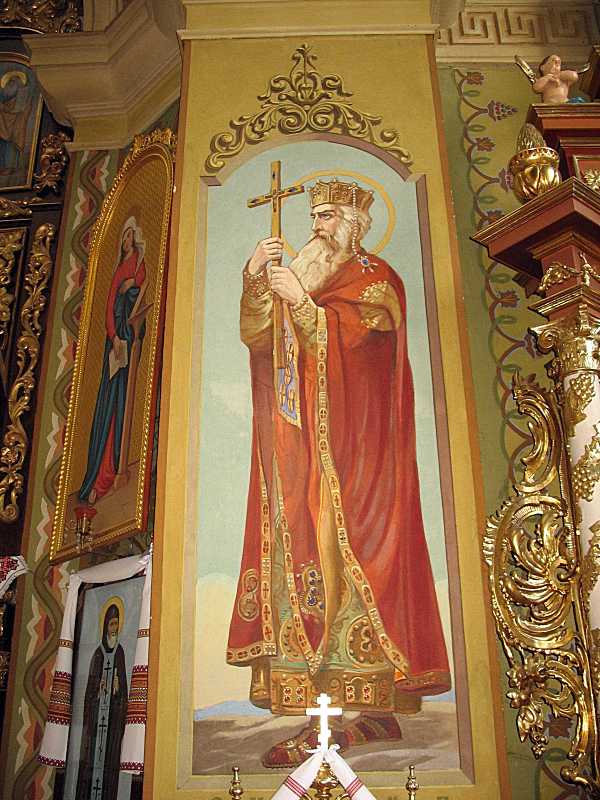 Стінопис «Св. князь Володимир»Розмір зображення: 600:800 піксел Фото Зенона Боровця і Богдана Тхора, 12 серпня 2008 р. |