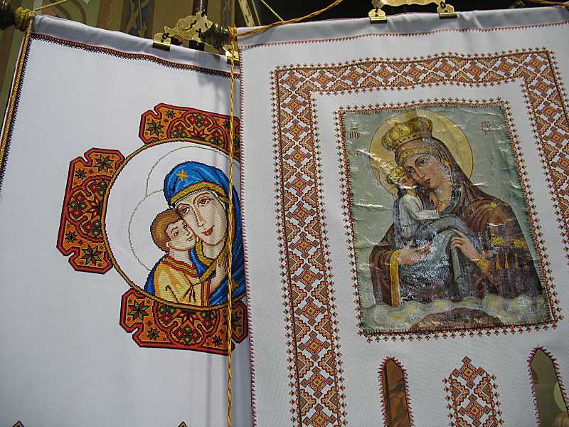 Вишиті хоругви з іконами «Богородиця замилування»Розмір зображення: 800:600 піксел Фото Зенона Боровця і Богдана Тхора, 12 серпня 2008 р. |