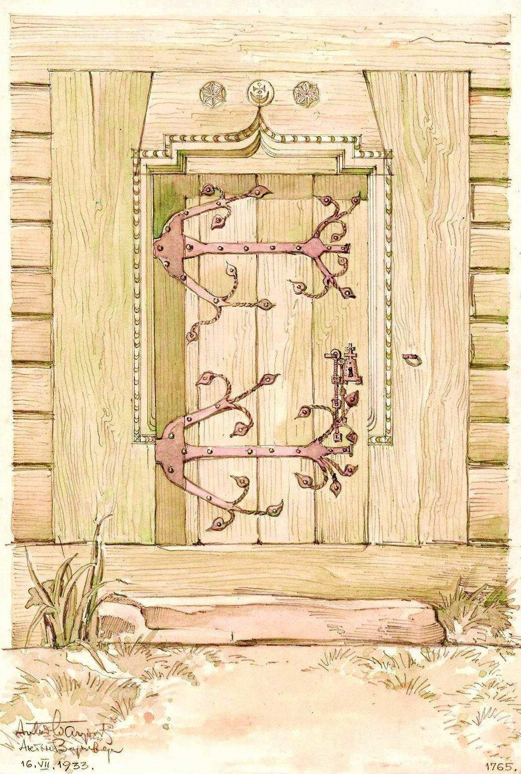 ДверіРозмір зображення: 1047:1555 піксел Рисунок Антона Вариводи (Краків), 16.07.1933 р. 1765 Church, Koropuzh, Sambir, Ukraine. Main entrance carved door frame and dour with metal fittings and lock. |