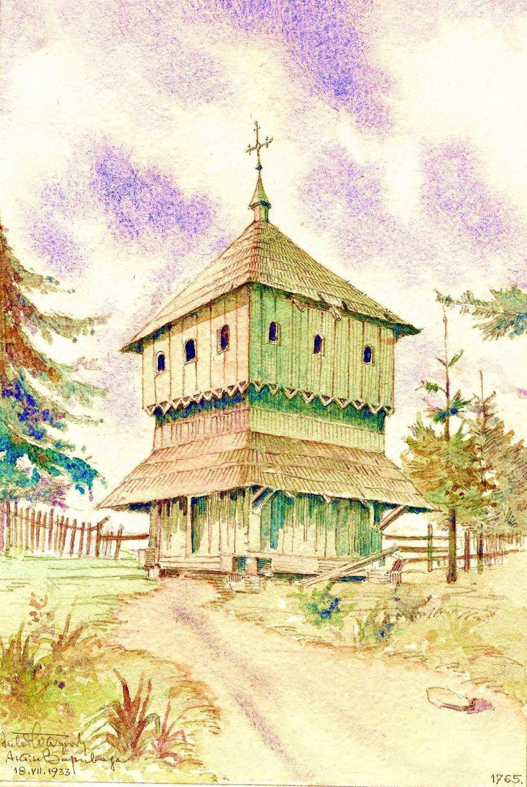 Загальний вигляд дзвіниціРозмір зображення: 1034:1545 піксел Рисунок Антона Вариводи (Краків), 18.07.1933 р. 1765 Church belltower, Koropuzh, Sambir, Ukraine. Southwestern view. |