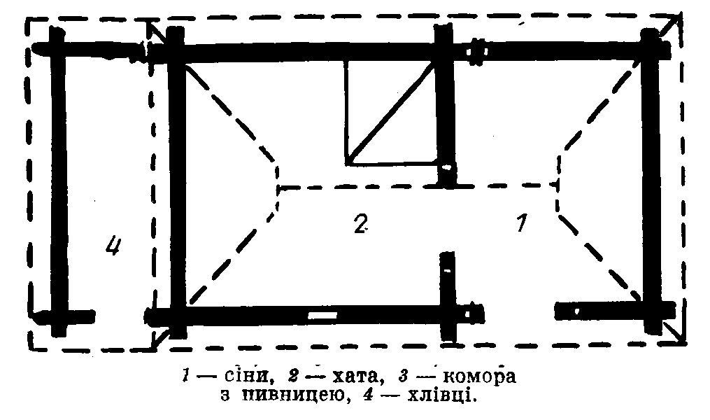 1 – сіни, 2 – хата, 3 – комора з пивницею, 4 – хлівці.
