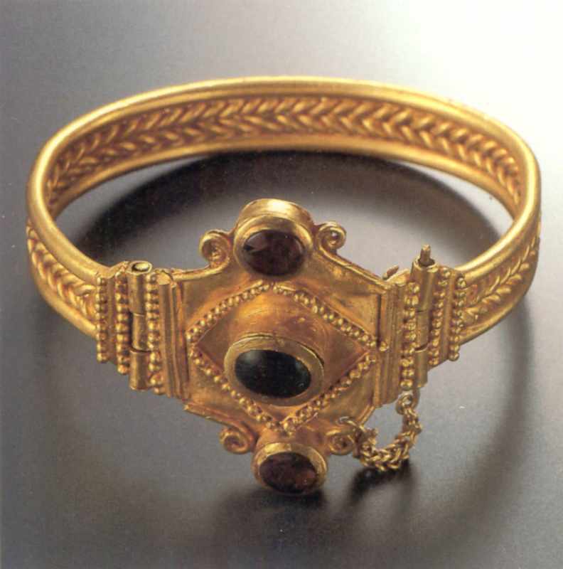 Золото, сердолік, скло. Діаметр 6.5 см, висота 1.1 см.