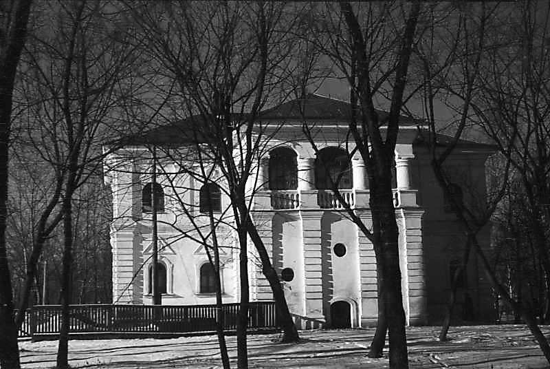 1977 р. Головний фасад Розмір зображення: 800:536 піксел 1977 р. 6 січня. Фото М.І.Жарких. Негатека, № A219-21. Вкладені елементи Фрагмент фасаду