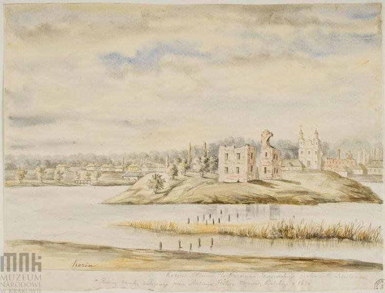 Ruiny zamku Tarnowskich dawniej Firlejów i kościół podominikaski. Widok od strony wody. Na wyspie ruiny zamku; z prawej strony w głębi fasa… wieżowego kościoła podominikańskiego i ruiny klasztoru. 1862 – 1876. Napis: Kozin; Własność Hr. Kaźmierza Tarnowskiego z. Marya Hr. Ledochowska. Ruiny założonego przez Andrzeja Firleja Wojewodę Bełzkiego r. 1630; napis na pod… Wołyń. Kozin. Rys. ołówkiem podmalowany akwarelą, 21,5x28,5. Ill-r.a. 4177 (Teka Wołyń). [Katalog rysunków architektonicznych ze zbiorów Muzeum narodowego w Krakowie. 1. Rysunki Napoleona Ordy / Opracowały Zofia Kucielska i Zofia Tobiaszowa. – Warszawa: Państwowe wydawnictwo naukowe, 1975, Nr. 337]