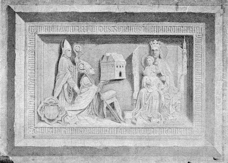 На плиті справа зображена богородиця з дитиною Ісусом на колінах, який благословляє правою рукою. Перед нею стоїть на колінах єпископ, який підносить кам’яницю з подвійним дахом. За ним знаходиться щит з гербом Дембно (Олесницьких). Другий єпископ підтримує першого.