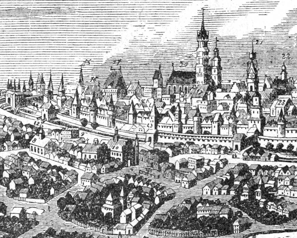 8 – костел св.Петра; 9 – двір біскупа; 10 – костел Введення; 11 – Флоріанська брама (зліва вгорі); 12 – Славківська брама; 13 – Швецька брама; 14 – Віслянська брама; 15 – костел св.духа; 16 – костел св.хреста; 17 – костел св.Марка; 18 – костел св.Матфія [не бачу]; 19 – костел св.Стефана [не бачу]; 20 – костел діви Марії; 21 – ратуша; 22 – костел домініканців; 23 – колегіата св.Анни