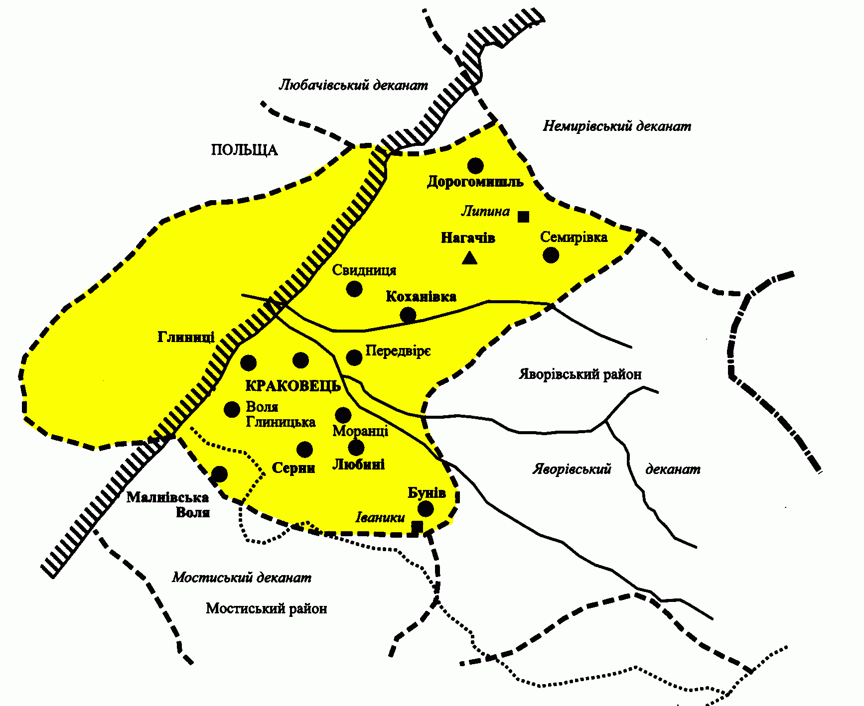 Картосхема деканату за В.СлободяномРозмір зображення: 1734:1418 піксел Джерело: Слободян В. Церкви України: Перемиська єпархія. – Льв.: 1998 р., с. 247. |