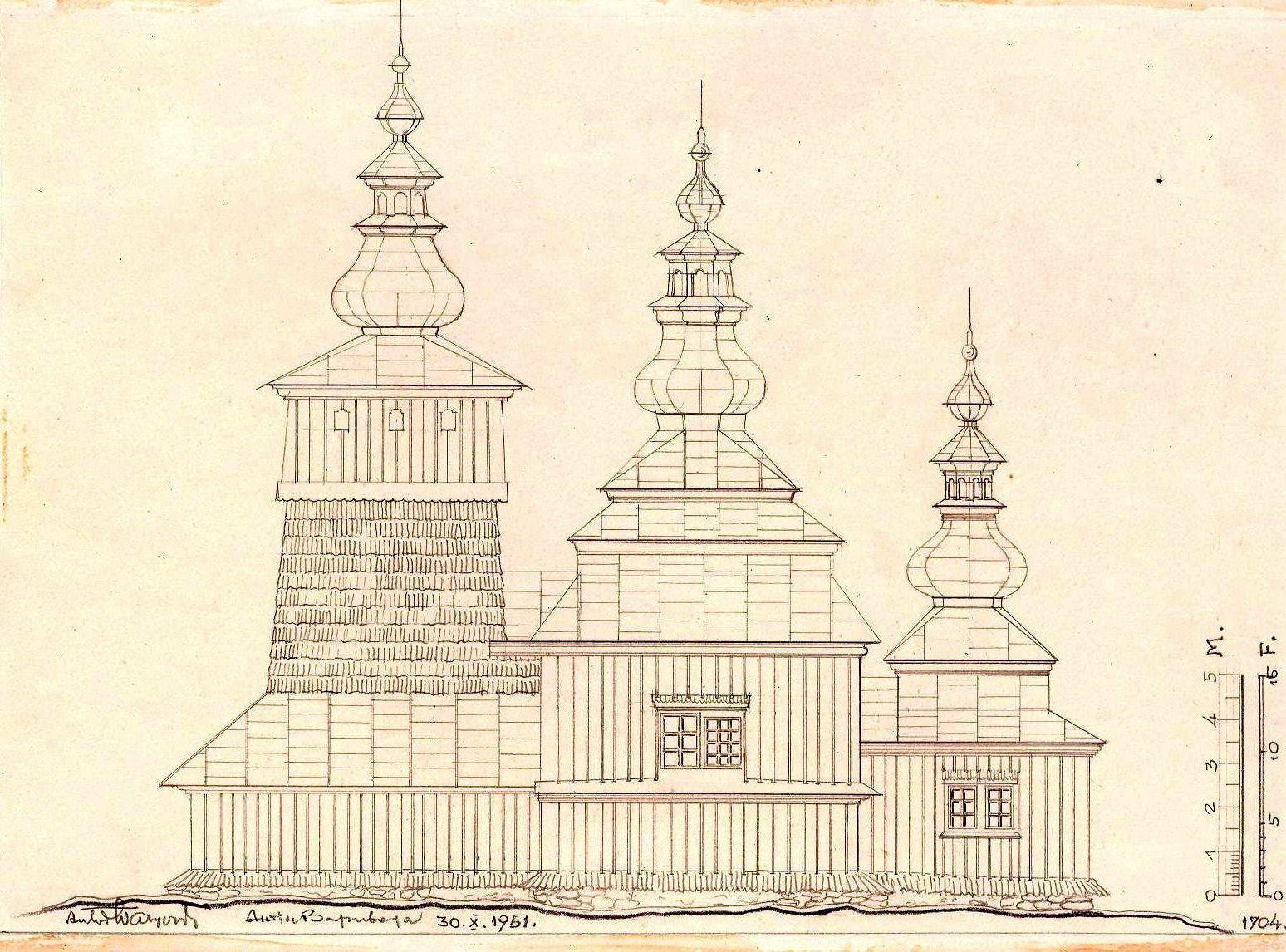 1961 р. Південний фасадРозмір зображення: 1548:1146 піксел Рисунок Антона Вариводи (Краків), 30.10.1961 р. 1704 Church, Krampna (Krempna), Yaslo, Poland. South elevation. |