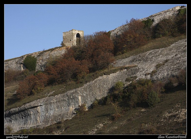 Вигляд башти з ущелини Черкес-КерменРозмір зображення: 784:570 піксел Фото: Ярослав Кузнецов, 8 листопада 2008 р.