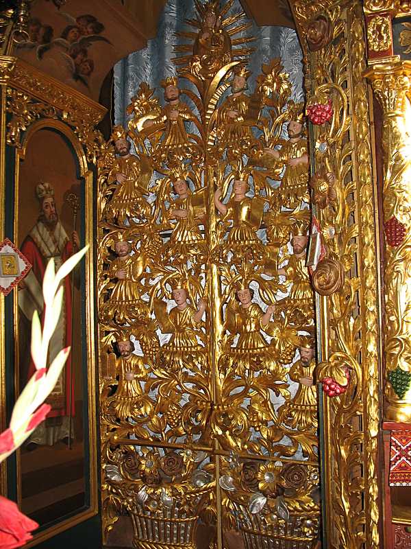 Царські вратаРозмір зображення: 600:800 піксел Фото Зенона Боровця і Богдана Тхора, 11 серпня 2008 р. Із зображенням «дерева Ієсеєва». Нумерація фігур іде згори вниз, коремо для лівої частини (Лів-1 – 6) і правої (Прав-1 – 6). |