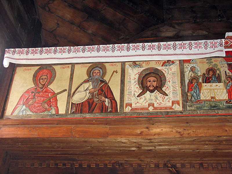 Ліва половина ряду ікон Розмір зображення: 800:600 піксел Фото Зенона Боровця і Богдана Тхора, 11 серпня 2008 р. Вкладені елементи Св. Параскева Св. Сава [Сербський] Спас на убрусі Ветхозавітна Трійця