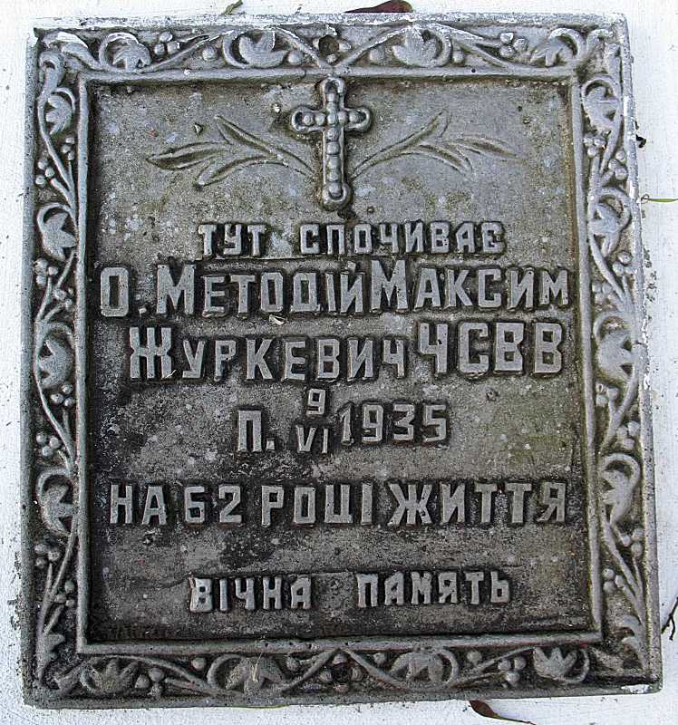 Напис: «Тут спочиває о. Методій Максим Журкевичп[омер] 9.05.1935 р. на 62 р[оці[ життя. Вічна пам’ять».