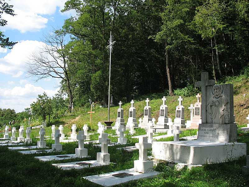 Фрагмент цвинтаря (2)Розмір зображення: 800:600 піксел Фото Зенона Боровця і Богдана Тхора, 8 липня 2007 р. Крайня праворуч могила має напис: «Тут спочиває в бозі о. Павло Демчук ЧСВВ (28.08.1873 – 1.04.1937)». |