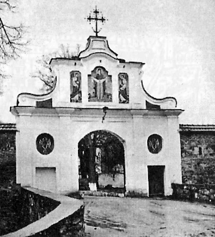 1998 р. Загальний вигляд в’їзної брамиРозмір зображення: 727:800 піксел с. Крехів. В’їзна брама монастиря. (фото В.Ольхом’яка, 1998) Джерело: Слободян В. Жовківщина: історико-архітектурні нариси церков. – Жовква: 1998 р., с. 86. |