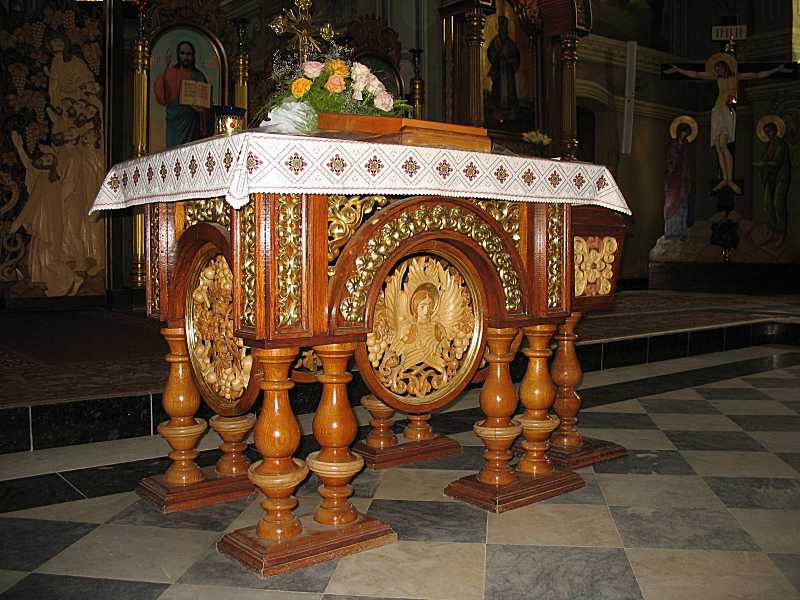 Аналой перед вівтарем Розмір зображення: 800:600 піксел Фото Зенона Боровця і Богдана Тхора, 8 липня 2007 р. Вкладені елементи Рельєф серафима Рельєфна розетка