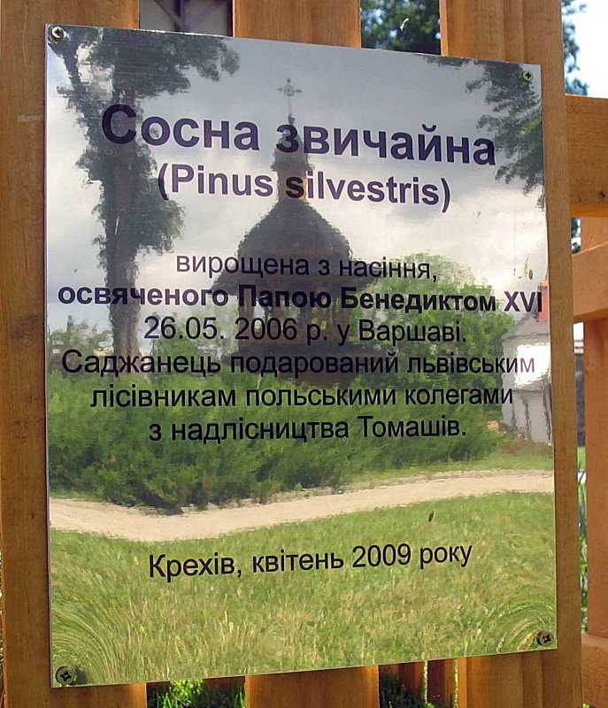 Напис: «Сосна звичайна (Pinus silvestris), вирощена з насіння, освяченого папою Бенедиктом 16-м 26.05.2006 р. у Варшаві. Саджанець подарований львівським лісівникам польськими колегами з надлісництва Томашів. Крехів, квітень 2009 р.».
