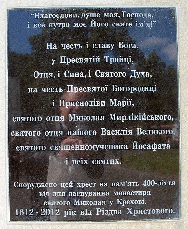 Напис: «Благослови, душе моя, господа і все нутро моє його святе ім’я! На честь і славу бога, у пресвятій тройці, отця, і сина, і святого духа, на честь пресвятої богородиці і пріснодіви Марії, святого отця Миколая Мірлікійського, святого отця нашого Василія Великого, святого священномученика Йосафата і всіх святих. Споруджено цей хрест на пам’ять 400-ліття від дня заснування монастиря святого Миколая у Крехові. 1612 – 2012 рік від різдва Христового».