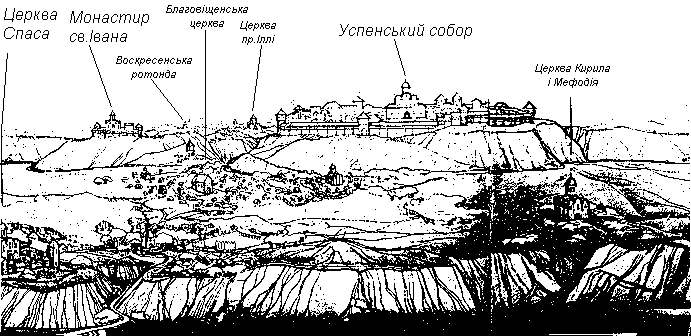 Вигляд Галича у 13 ст. (фрагмент розгортки)Розмір зображення: 691:336 піксел Джерело: Лукомський Ю.В. Архітектурна спадщина давнього Галича. – Галич: 1991 р. |