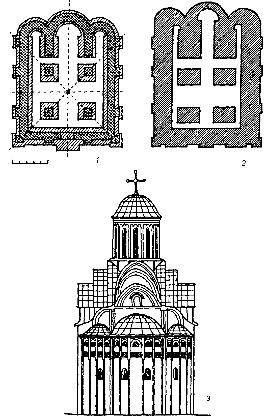 План фундаментівРозмір зображення: 1062:1654 піксел 1. план фундаментів з реконструкцією стін за Ю.Захарієвичем; 2. план фундаментів за О.Пеленським; 3. реконструкція П’ятницької церкви в Чернігові за М.Холостенком (аналогія) |