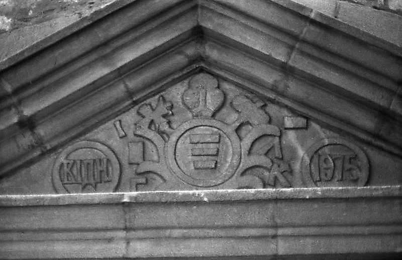 1988 р. Тимпан південного порталу з написом про відновлення в 1975 р.Розмір зображення: 800:519 піксел 1988 р. 12 червня. Фото М.І.Жарких. Негатека, № 389-24. |