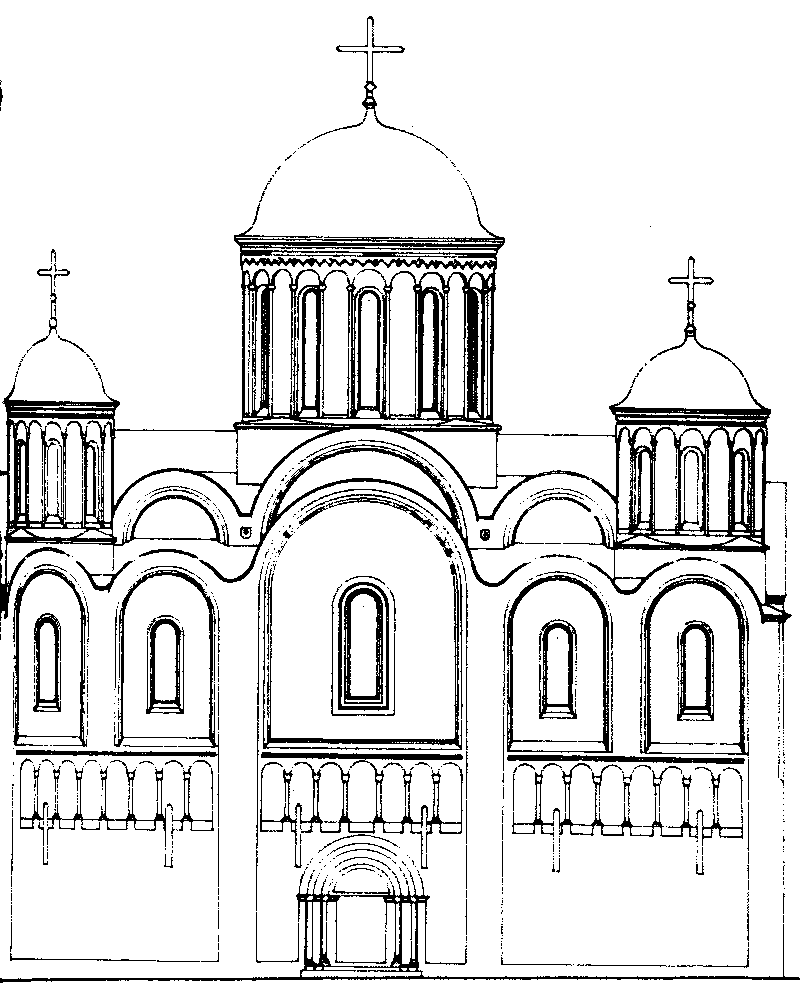 Варіант реконструкції (за В.Петриком і Ю.Лукомським), західний фасад Розмір зображення: 812:987 піксел Попередня сторінка | Вище | Наступна сторінка