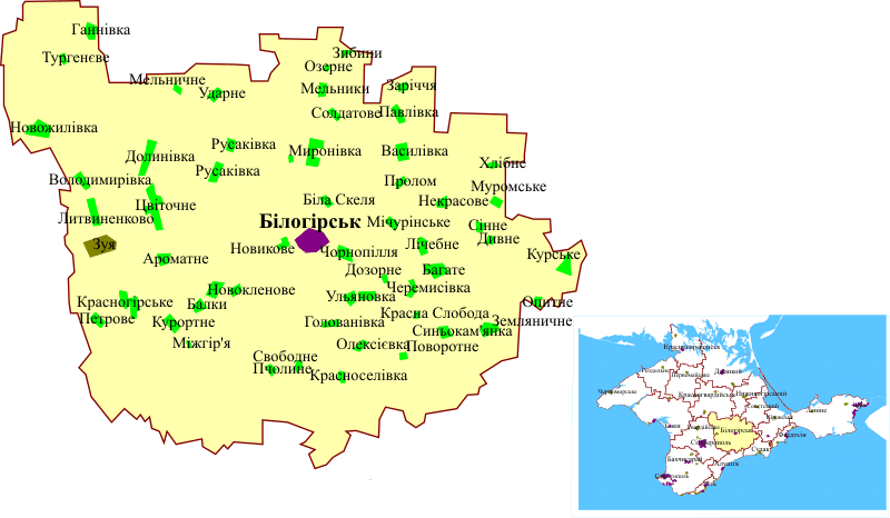 Переименование: Карасубазарский район в Белогорский район и районный центр город Карасубазар в город Белогорск. [Указ Президиума Верховного Совета РСФСР от от 14 декабря 1944 года «О переименовании районов и районных центров Крымской АССР» .]