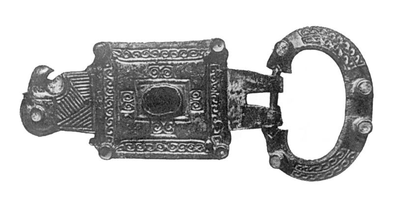 Большая пряжка с соколиной головкой украшала широкий парадный пояс. Орнаментирована углубленным рисунком и цветными вставками. Этническую принадлежность таких пряжек исследователи связывают с готским и местным разноэтничным населением Крыма.