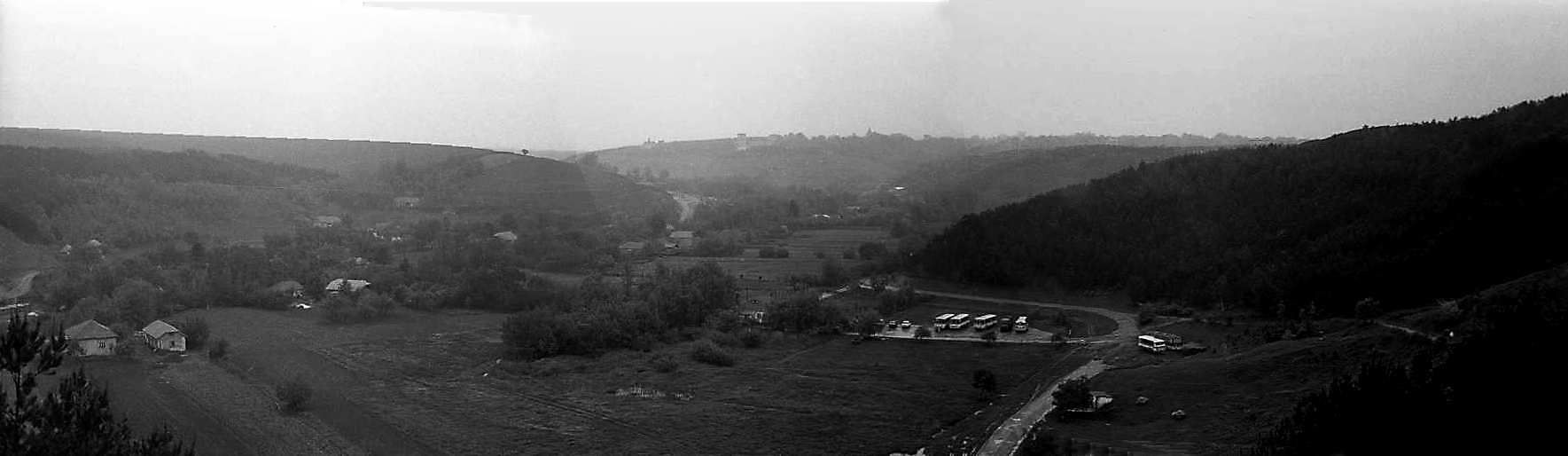 1985 р. Панорама села від печериРозмір зображення: 1769:514 піксел 1985 р. 19 травня. Фото М.І.Жарких. Негатека, № 286-13+5. |