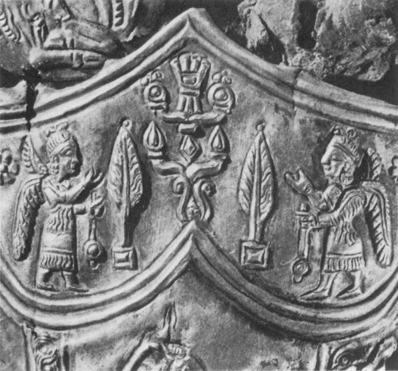 Крилаті люди біля вівтаряРозмір зображення: 800:745 піксел Джерело: Brasinszkij I.B. Szkita kincsek nyomaban. – Budapest: Helikon, 1985, № 31. |