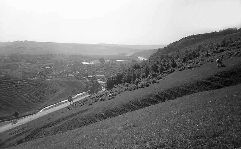 1978 р. Вид на долину Збруча із заходу (зліва – струмок, який огинає замок)Розмір зображення: 800:494 піксел 1978 р. 5 червня. Фото М.І.Жарких. Негатека, № 065-05. |