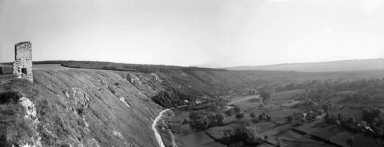 1978 р. Північна башта і панорама долини Збруча. Вигляд з південного сходуРозмір зображення: 1315:506 піксел 1978 р. 5 червня. Фото М.І.Жарких. Негатека, № 062-19+20. |