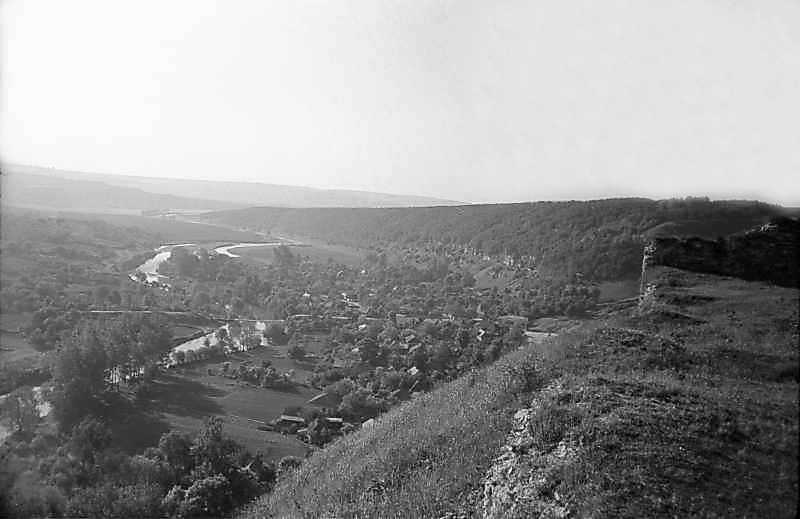 1978 р. Панорама села і площадка замку. Вигляд з північного заходуРозмір зображення: 800:519 піксел 1978 р. 5 червня. Фото М.І.Жарких. Негатека, № 063-29. |
