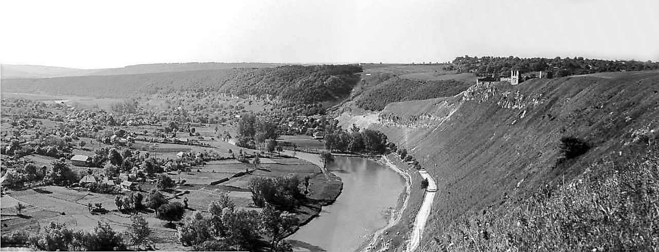 1978 р. Панорама села і замка з півночіРозмір зображення: 1282:490 піксел 1978 р. 5 червня. Фото М.І.Жарких. Негатека, № 066-01+2. |