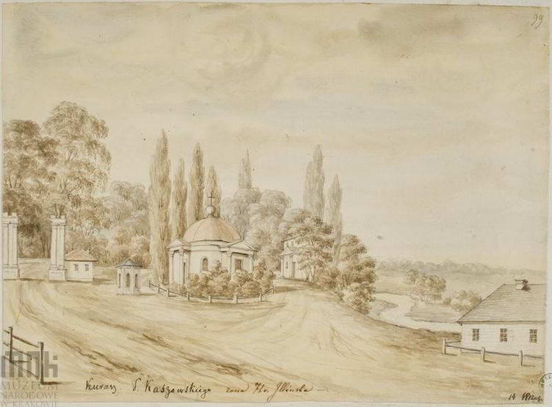 Kaplica i wjazd do parku. Widok od strony drogi dojazdowej. Kaplica centralna na planie koła z kopułą i po… tykami kolumnowymi; z lewej strony brama z parterową stróżówką; z prawej strony w głębi fragment dwukondygnacjowego budynku z portykiem kolumnowym. 1862 – 1876. Dat.: 14 Wrzes. Napis: Kurasz. P. Kaszowskiego żona Hr. Illińska; napis na podkładzie: G. Wołyńska. Kurasz, – kaplica. Rys. ołówkiem podmalowany akwarelą, 19,7x26,8. , [Il-r.a. 4182 (Teka Wołyń). [Katalog rysunków architektonicznych ze zbiorów Muzeum narodowego w Krakowie. 1. Rysunki Napoleona Ordy / Opracowały Zofia Kucielska i Zofia Tobiaszowa. – Warszawa: Państwowe wydawnictwo naukowe, 1975, Nr. 367]