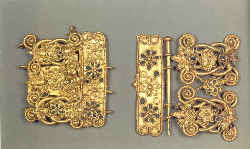 Частини двох пряжок для пояса, філігранно прикрашені Геракловими вузлами, розеток, пальмет, сувоїв і дисків з синьою емаллю.