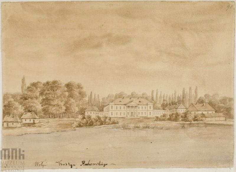 Pałac Rakowskich dawniej Steckich. Widok od strony wody. Pałac dwukondygnacjowy z portykiem kolumnowym w wielkim porządku, dwiema oficynami połączonymi z korpusem ćwierćkolistymi (?) galeriamy. 1862 – 1876. Napis: Wołyń; Kustyń Rakowskiego; napis na podkładzie: G. Wolyńska. Kustyń, -paląc. Rys. ołówkiem podmalowany akwarelą i sepią, 19,7x27,2. III-r.a. 4183 (Teka Wołyń). Bibl.: Aftanazy, Architekt Merk, ii. po s. 472; Ross, Kilka uwag o genezie, s. 228, ii. 6; Jaroszewski, O dwu grupach polskich rezydencji il. 30; Jaroszewski, Architektura doby Oświecenia, il. 87. [Katalog rysunków architektonicznych ze zbiorów Muzeum narodowego w Krakowie. 1. Rysunki Napoleona Ordy / Opracowały Zofia Kucielska i Zofia Tobiaszowa. – Warszawa: Państwowe wydawnictwo naukowe, 1975, Nr. 373]