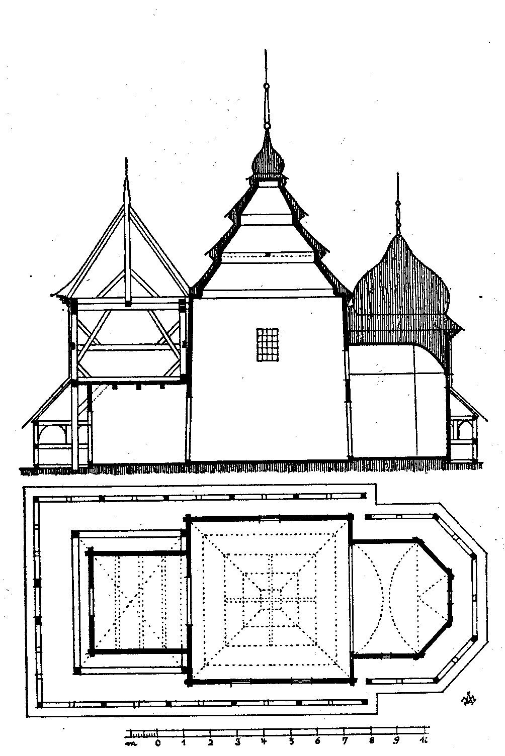 Поздовжній переріз і планРозмір зображення: 1004:1504 піксел Джерело: Драган М. Українські деревляні церкви. – Льв.: 1937 р., т. 2, с. 50. |