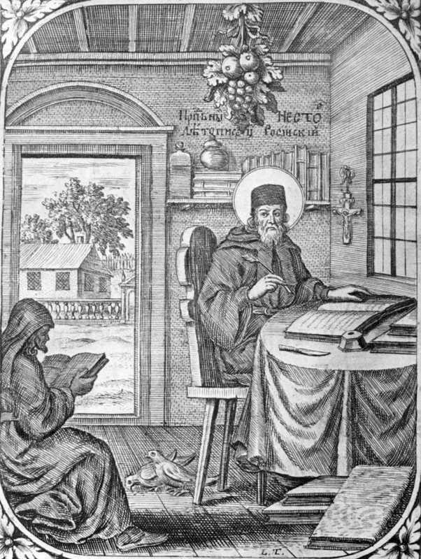 На гравюрі зображено одного з найдавніших київських письменників, автора першого давньоруського літопису «Повість временних літ», що дійшов до нашого часу в кількох редакціях. Інтер’єр, а також краєвид за дверима – сучасні Леонтію Тарасевичу і характерні для Києво-Печерської лаври кінця XVII-початку XVIII ст.