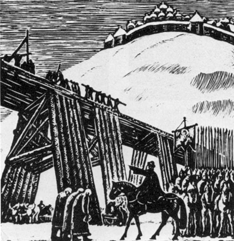 За літописом, 1115 року, коли князював Володимир Мономах, навпроти Подолу, як гадають деякі вчені, був побудований дерев’яний міст через Дніпро. Художник спробував дати реконструкцію західної частини мосту.