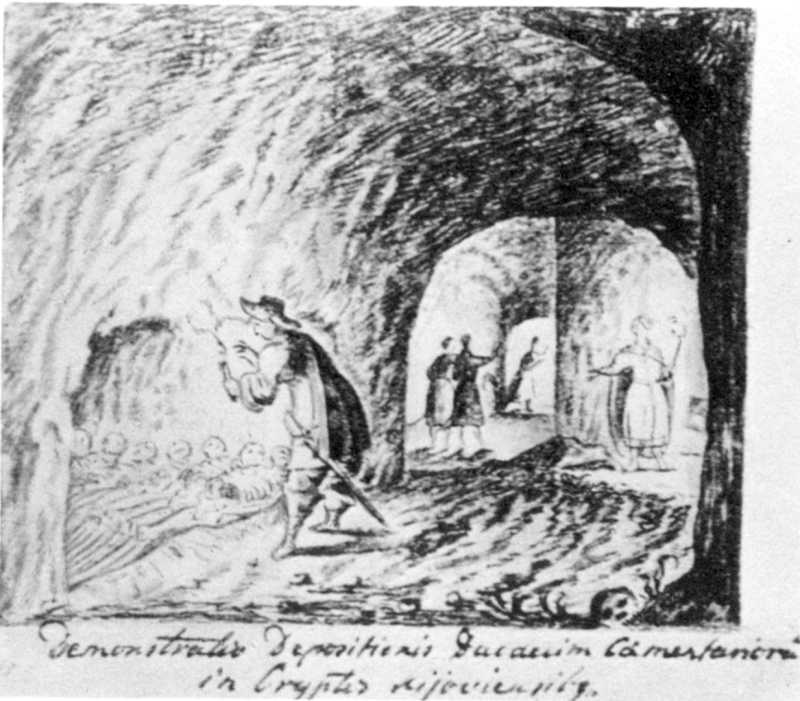 Києво-Печерський монастир, час заснування якого відносять до 1051 p., спочатку містився в печерах. Ближні печери започатковані 1058 р. В кінці XV ст. печери відкриті для огляду. Малюнок зроблений, імовірно, по пам’яті, оскільки в ньому неточно зображено закрут коридора біля поховання дванадцяти легендарних будівників Успенського собору, що його оглядає, можливо, сам автор малюнка. Ширина і висота печер перебільшені.