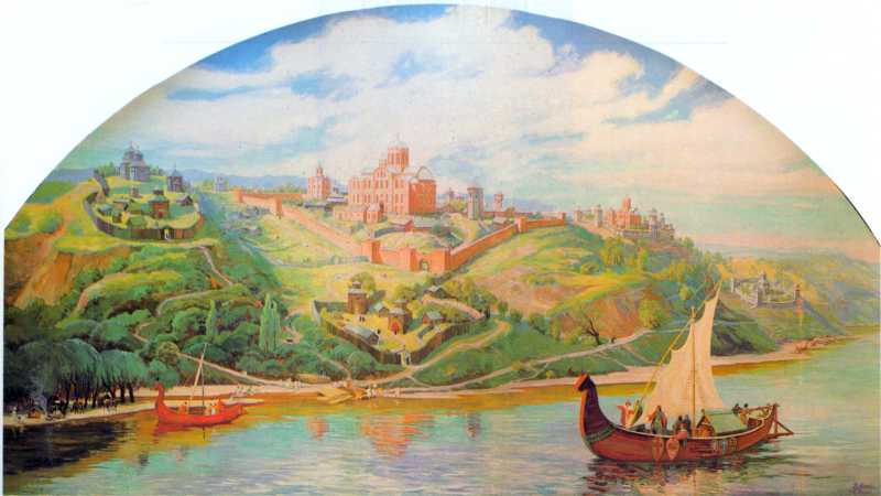Панорама високого правого берега Дніпра включає в себе Києво-Печерську лавру, що складається з трьох комплексів: монастиря на верхній території, а також монастирів Ближніх і Дальніх печер на нижній території. Кожен із них оточений стінами: печери – дерев’яними, а верхня частина – кам’яними, збудованими в кінці XII ст. Мурованими спорудами верхньої території є також Успенський собор (1072-1076) і Троїцька надбрамна церква (1106-1108). Праворуч від Лаври лежить князівське село Берестове, де знаходився заміський князівський замок і церкви – Апостолів та Спаська. Нижче й праворуч від Берестового урочища – урочище Угорське, де, за переказами, був похований князь Аскольд і де літописний Олма поставив Миколаївську церкву.