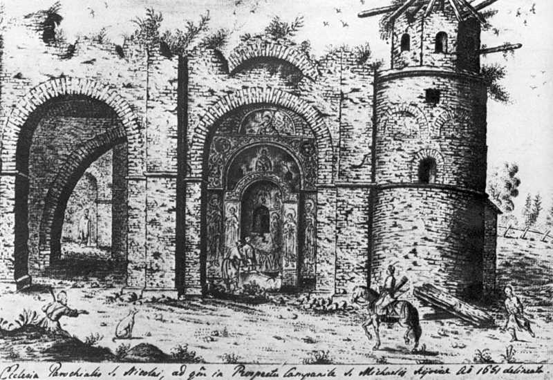 На малюнку зображена частина Софійського собору. Видно інтер’єр храму через відкриті галереї, що оперізували основний об’єм з півночі, заходу і півдня. Другий поверх внутрішньої південної галереї показано зруйнованим. Хоча на малюнку вежа кругла, пізніші дослідження довели, що нижня її частина мала зовні прямокутну форму і тільки на рівні другого поверху вежа була круглою.