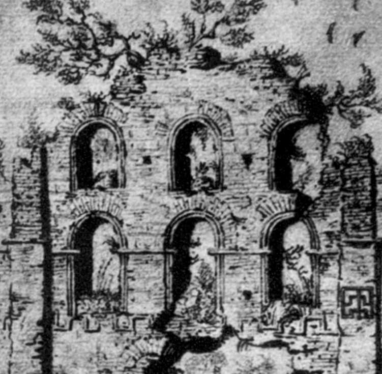 Центральна частина фасадуРозмір зображення: 751:735 піксел Джерело: Крізь віки: Київ в образотворчому мистецтві 12 – 20 ст. – К.: Мистецтво, 1982 р., № 47. |