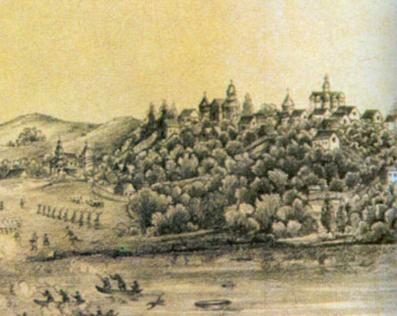 Правий фрагмент забудовиРозмір зображення: 800:638 піксел Джерело: Крізь віки: Київ в образотворчому мистецтві 12 – 20 ст. – К.: Мистецтво, 1982 р., № 52. |